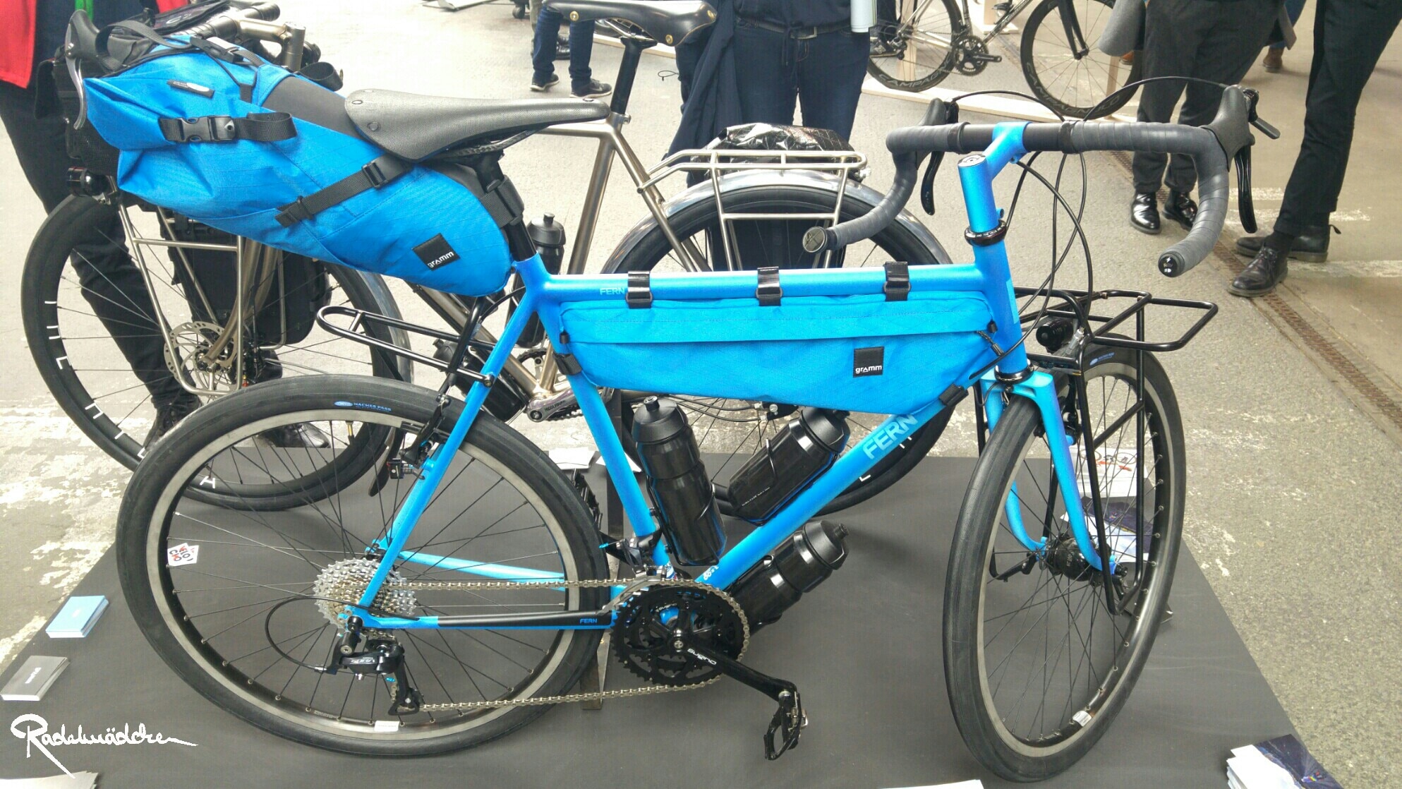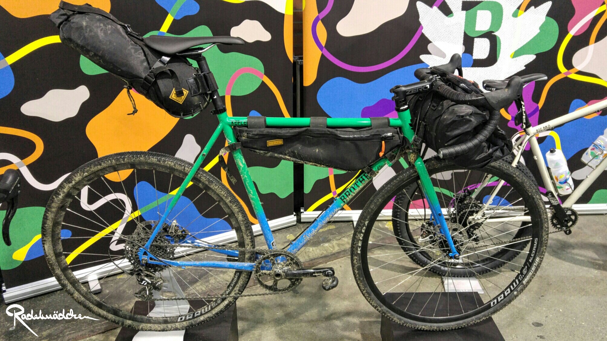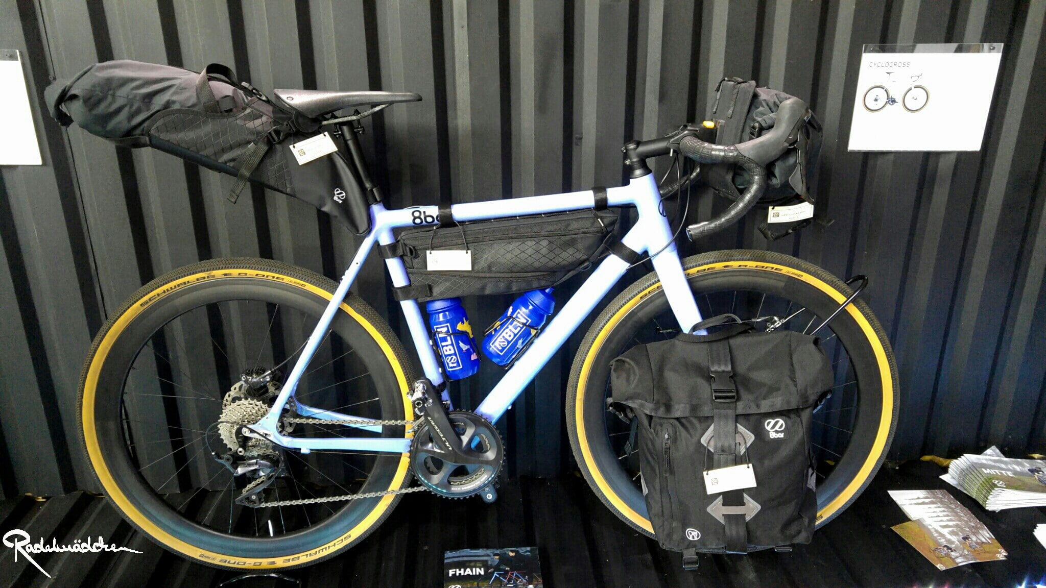 Auf der BFS waren viele Räder in dem Stil ausgestellt und wurden gleich mit den passenden Taschen gezeigt. Diese waren zum Beispiel von gramm (hergestellt in Berlin), ortlieb (Made in Germany) und restrap (aus England), sowie der neuen Eigenmarke vom Berliner Fahrradlabel 8 bar. Im Gegensatz zu den anderen genannten Marken sind diese Taschen allerdings nur wasserabweisend und nicht komplett dicht. Dafür ist der Preis fast unschlagbar: Die Satteltasche mit Packsack und Holster z.B. für 59€, die Rahmentasche für 39€. Gut sehen die Bikepacking-Taschen alle aus!