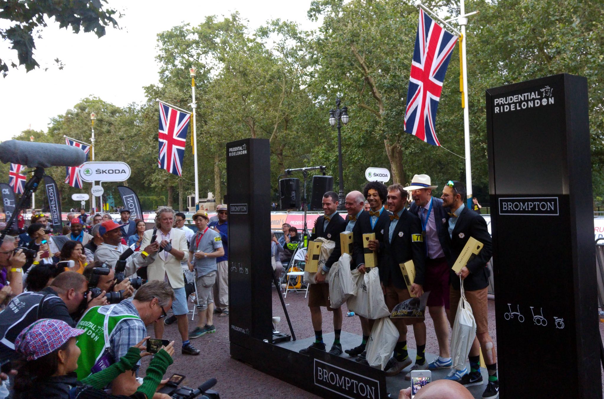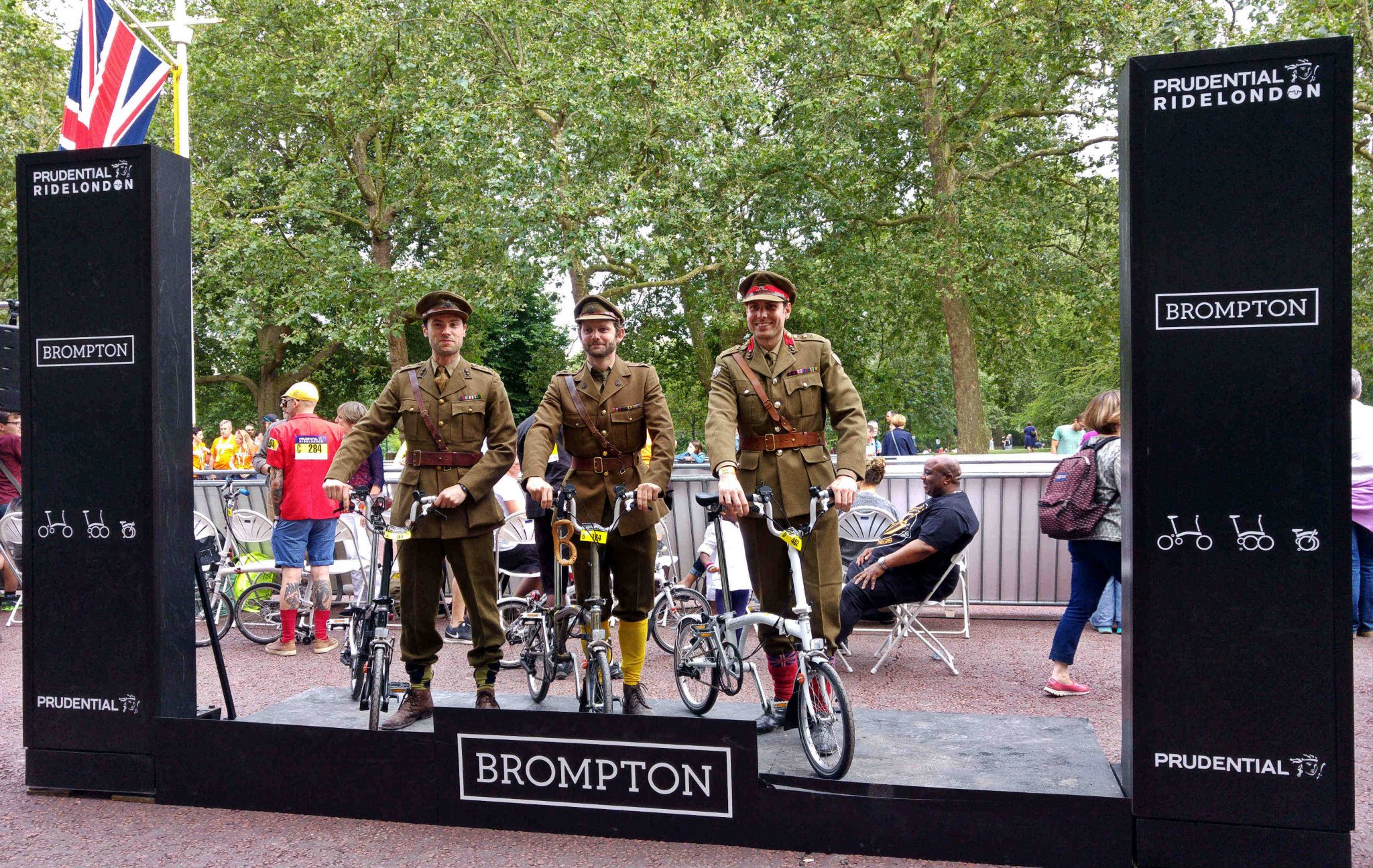 Am Samstag, 30.07.2016 war es dann endlich soweit. Gegen Mittag öffnete die Brompton Hospitality Area, für die man vorab ein Ticket erwerben konnte. Dafür bekam man vor Ort Getränke, warmes Essen und einen guten Blick auf das Rennen und die Bühne bei der Preisverleihung. Ich war eigentlich den halben Tag damit beschäftigt, die vielen und vielfältig kreativ gestalteten und konfigurierten Brompton Falträder anzugaffen. Aus den verschiedensten Ländern waren die Rennteilnehmer angereist, um ihre Räder zu präsentieren und sich bei dem wichtigsten Rennen des britischen Faltradherstellers zu beweisen. Es blieb viel Zeit für Fotos, angenehme Gespräche, Fotos, Fachsimpeleien, Fotos und noch mehr Aufregung und Fotos.