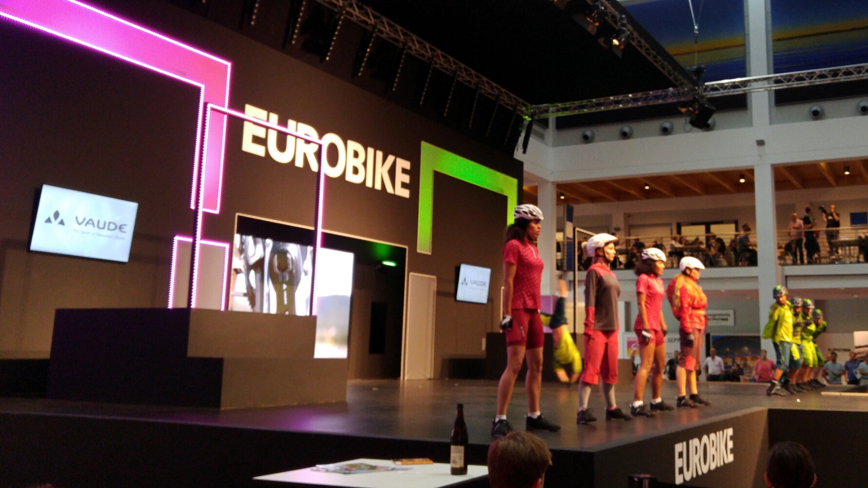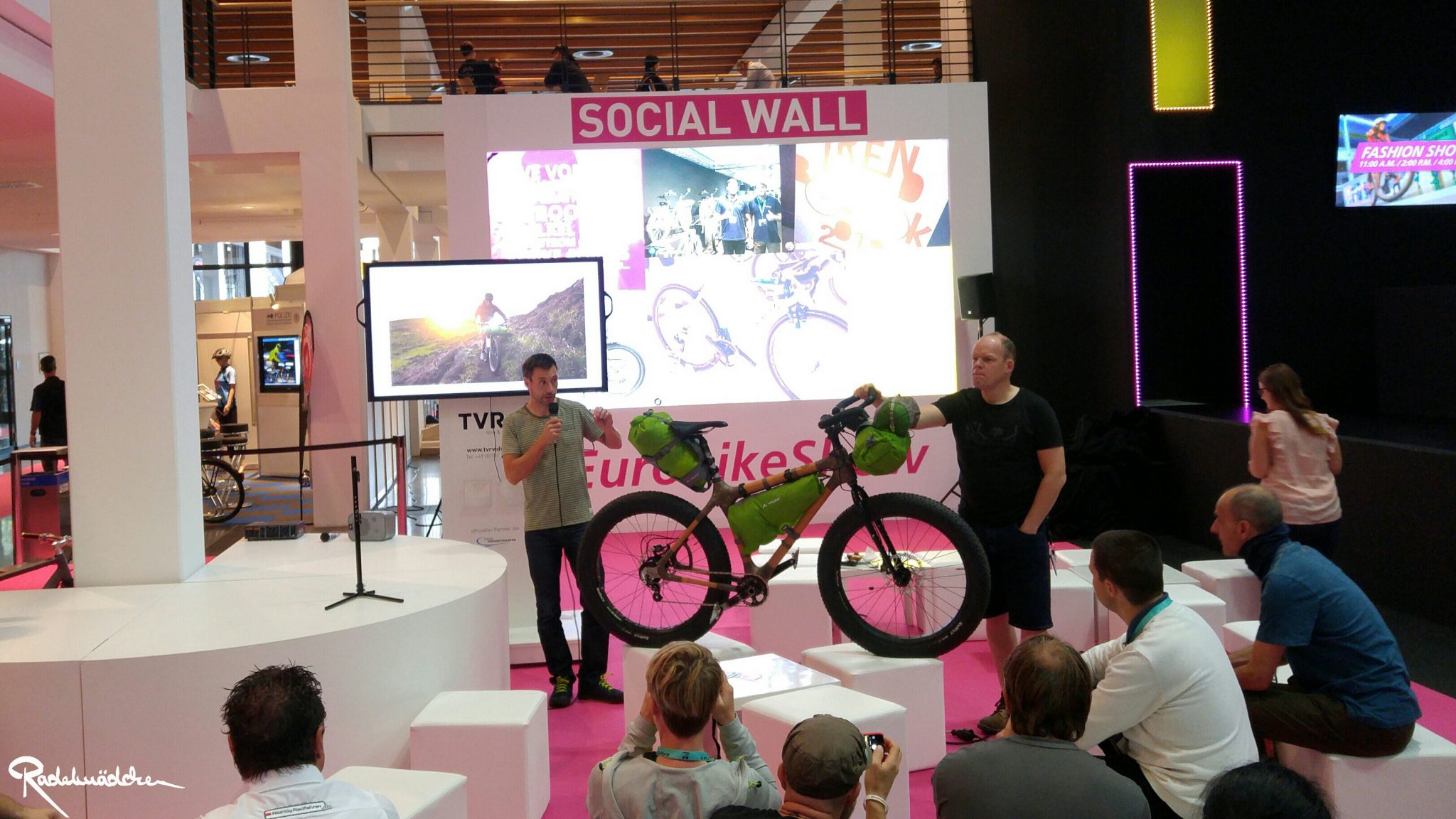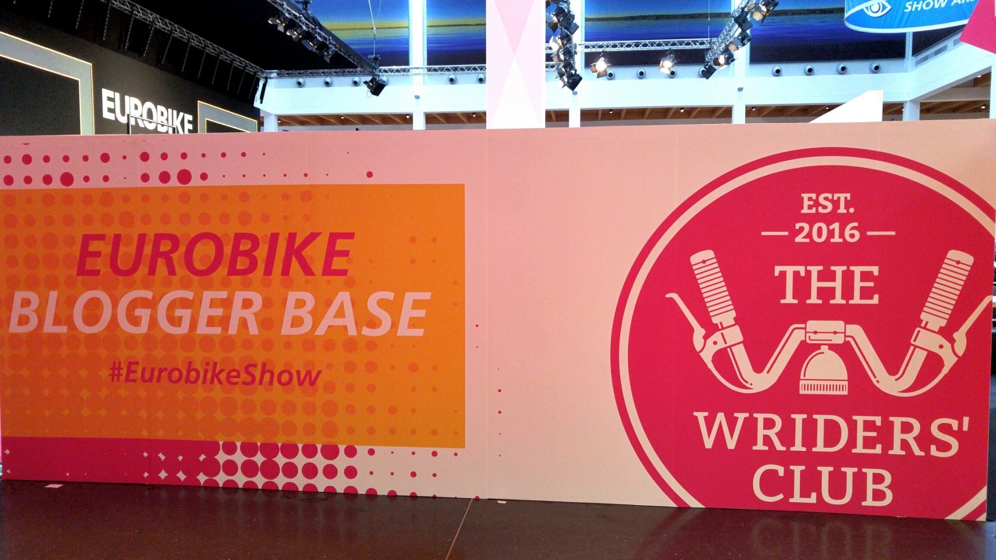 Bevor ich jedoch allein über die Messe stromern sollte, führte mich mein erster Gang am Donnerstagmorgen direkt ins Foyer Ost, wo es erstmalig die Eurobike Blogger Base geben sollte! Es war ein Bereich direkt neben der Showbühne, der für akkreditierte Fahrradblogger vorgesehen war. Dort starteten die Rundgänge, fanden Treffen statt und war die Möglichkeit geboten, sich einfach mal kurz hinzusetzen und auszuruhen. Für mich wurde die Blogger Base schnell der Ausgangspunkt für meine Messestreifzüge und war außerdem ein toller Ort, um sich mit anderen Bloggern auszutauschen. Nachdem „The Wriders‘ Club“ im Vorjahr ins Leben gerufen wurde, war diese Base der nächste Schritt, um aktive Fahrradblogger zu vernetzen. Vielen, vielen Dank an Mirjam und alle anderen von der Eurobike, sowie an Gunnar, die das umgesetzt haben!