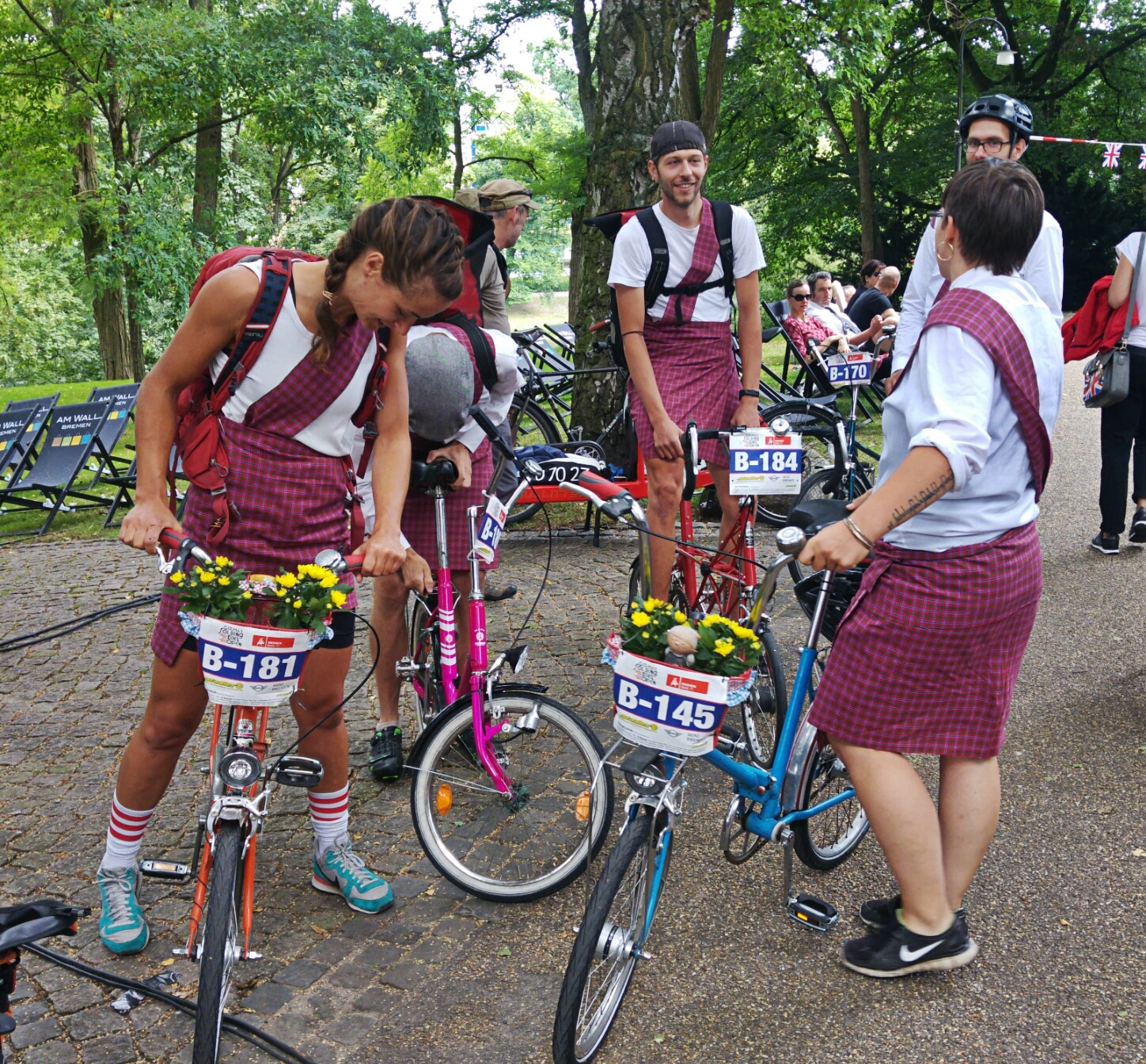 Ein Wochenende, das so toll begann, konnte nur noch besser werden, in dem unser Team #hamburgfiets wieder zusammen kam. Am Sonntag fanden die German Folding Bike Open statt. Im Vergleich zur Brompton World Championship (BWC) war dort jeder Falt- und Klappradtyp willkommen. Es war schön ein paar Gesichter wieder zu sehen und neue Menschen kennen zu lernen. Auch das Beobachten und begutachten der Räder gehörte natürlich dazu und so sah ich einige Kuriositäten der alten und neuen Generation. Die Outfits nahmen sich in der Hinsicht allerdings nichts nach. Dawid nahm derweil mal eben noch am 100 m-Sprint teil.