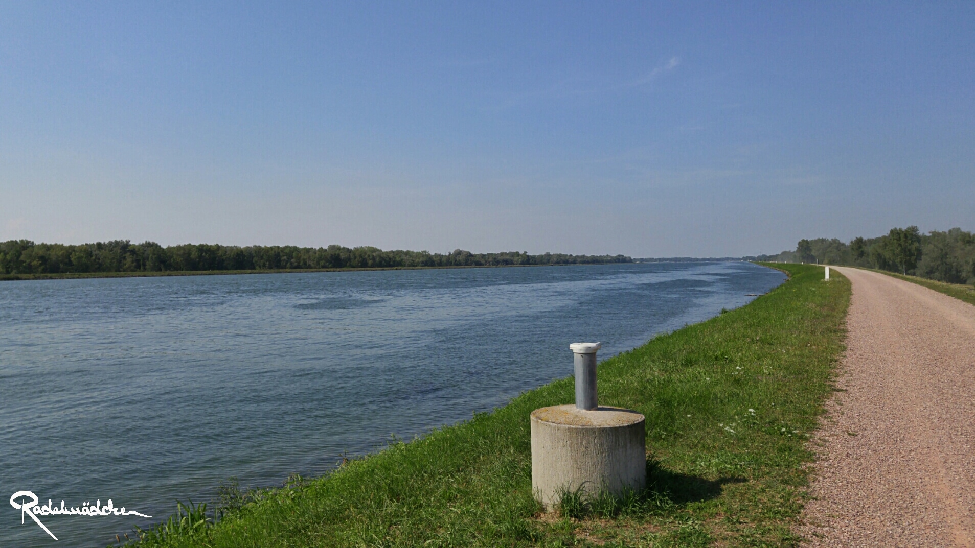 Ich verließ Straßburg gegen Mittag und radelte auf der französischen Seite weiter bis zu einem Wasserkraftwerk, dass auf einer Rheininsel liegt. Diese steht unter Naturschutz und darf mit dem Auto nicht befahren werden. Ich war fast völlig allein, als die Sonne um die Mittagszeit auf mich herabbrezelte und es sehr still wurde um mich herum. Das war ein seltsames Gefühl, aber auch irgendwie sehr schön.