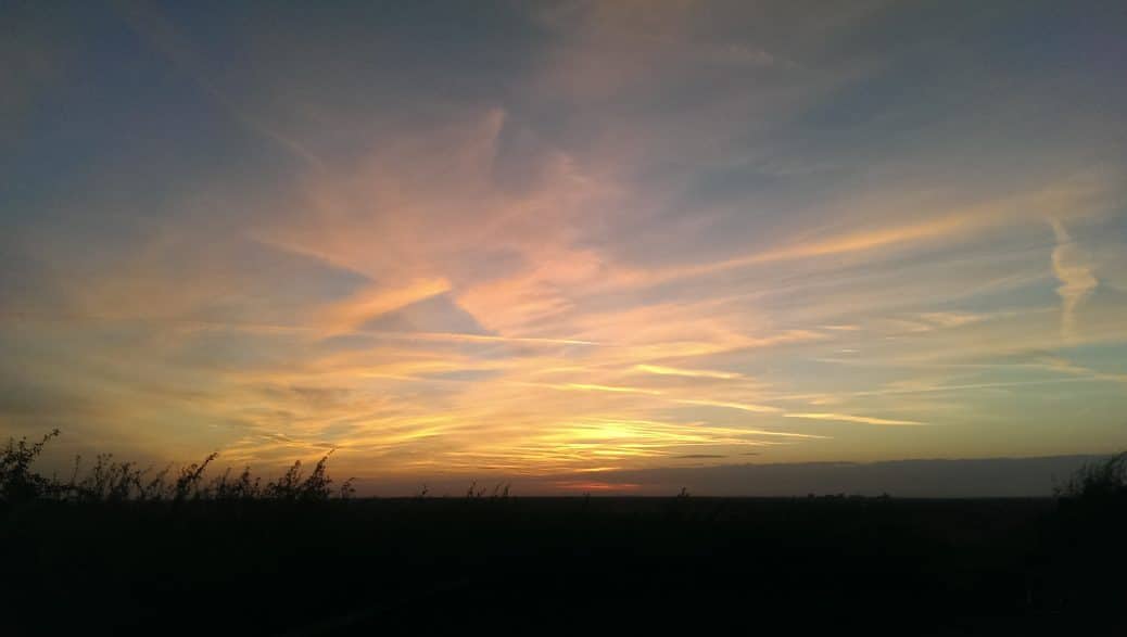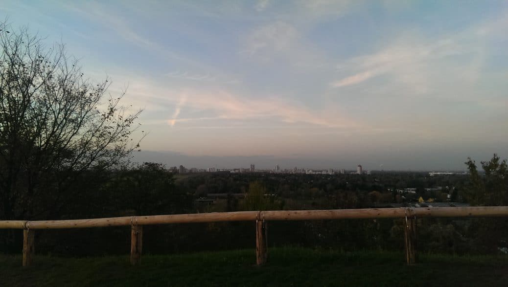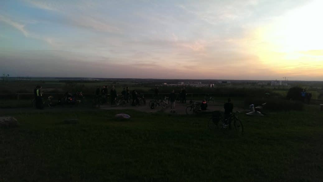 Den Endpunkt bildete eine Anhöhe, Dörferblick genannt, von wo aus man einen Blick auf den Sonnenuntergang erhaschen konnte , den wir während der Auffahrt noch rot schimmernd sahen( zeitlich möglich dank einer Interaktion mit der Polizei, die uns in Neukölln wenigstens eine halbe Stunde aufhielt und damit endete, dass wir uns halbierten und nur noch in Zweier-Reihung nebeneinander her radeln durften) plus Aussicht auf den Flughafen Schönefeld und die Stadt mit Fernsehturm und diversen Hochhaussiedlungen.