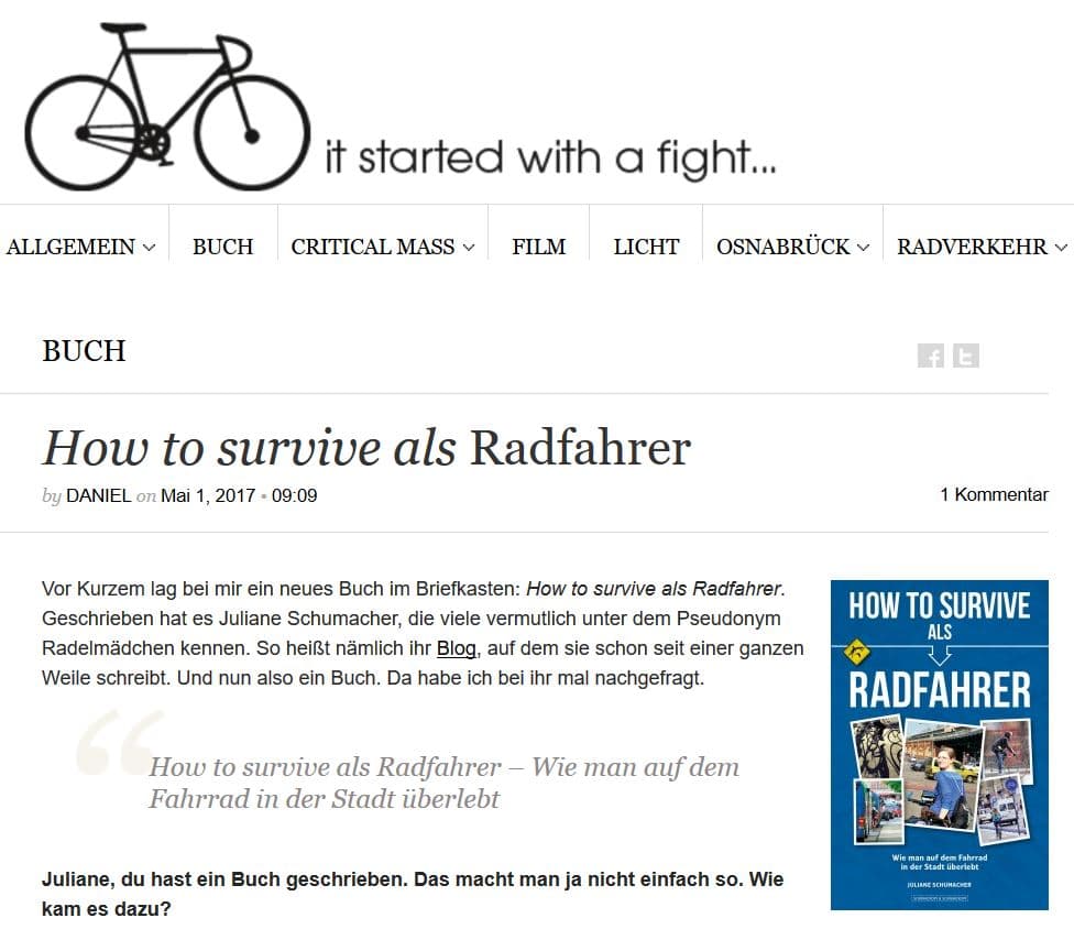 Zum offiziellen Release meines Buches „How to survive als Radfahrer“ möchte ich euch eine kleine Zusammenfassung über das geben, was bisher darüber berichtet wurde. Ich habe ein paar Beispiele heraus gepickt. Außerdem möchte ich vor Freude und Stolz über mein erstes eigenes Werk, drei Bücher verlosen! Dazu weiter unten mehr.