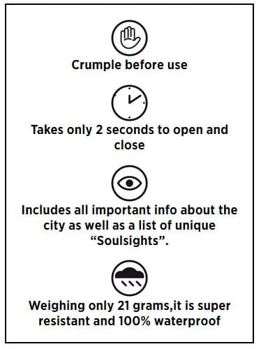 Klein zusammengerollt kommt die Stadtkarte in einer transparenten Plastikbox, auf der die Funktionsweise durch eine Beschriftung leicht erklärt ist: Karte aufrollen und erst einmal zusammen knüllen. Dabei kann man sich über die ungewöhnliche Haptik wundern, die an weiches, glattes Papier erinnert, aber auch einen stofflichen Charakter hat.