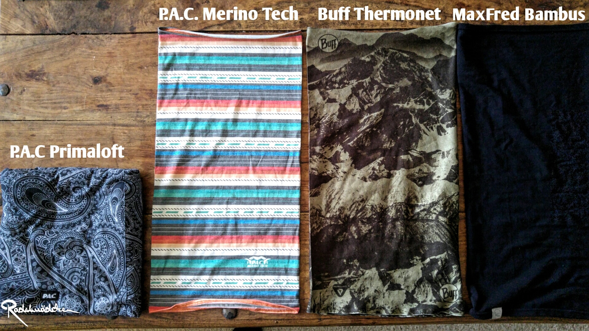 Im Test waren zwei Tücher von den deutschen Marken P.A.C. und MaxFred, sowie der spanischen Marke Buff, die vermutlich am bekanntesten in diesem Accessoirefeld ist. Mein Ergebnis habe ich nach einer kurzen Markenbeschreibung in den Kategorien Material/Funktion, Optik /Haptik, Alltagstauglichkeit und Fazit zusammengefasst. Bis auf den Primaloft Snood von P.A.C. sind alle Multifunktionstücher etwa 50 cm lang und 23 cm breit.