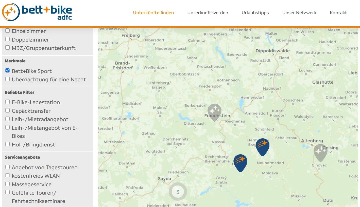 Die Suche nach der passenden Bett + Bike Unterkunft für die Radreise wird dank der digitalen Karte deutlich einfacher. Auf der Bett + Bike Website kannst du nach fahrradfreundlichen Unterkünften suchen! Egal ob Hotels/Pension, Ferienwohnung, Campingplatz oder spezielle Sport-Unterkunft mit erweitertem Serviceangebot, es ist was für jeden Geschmack und Geldbeutel dabei.
