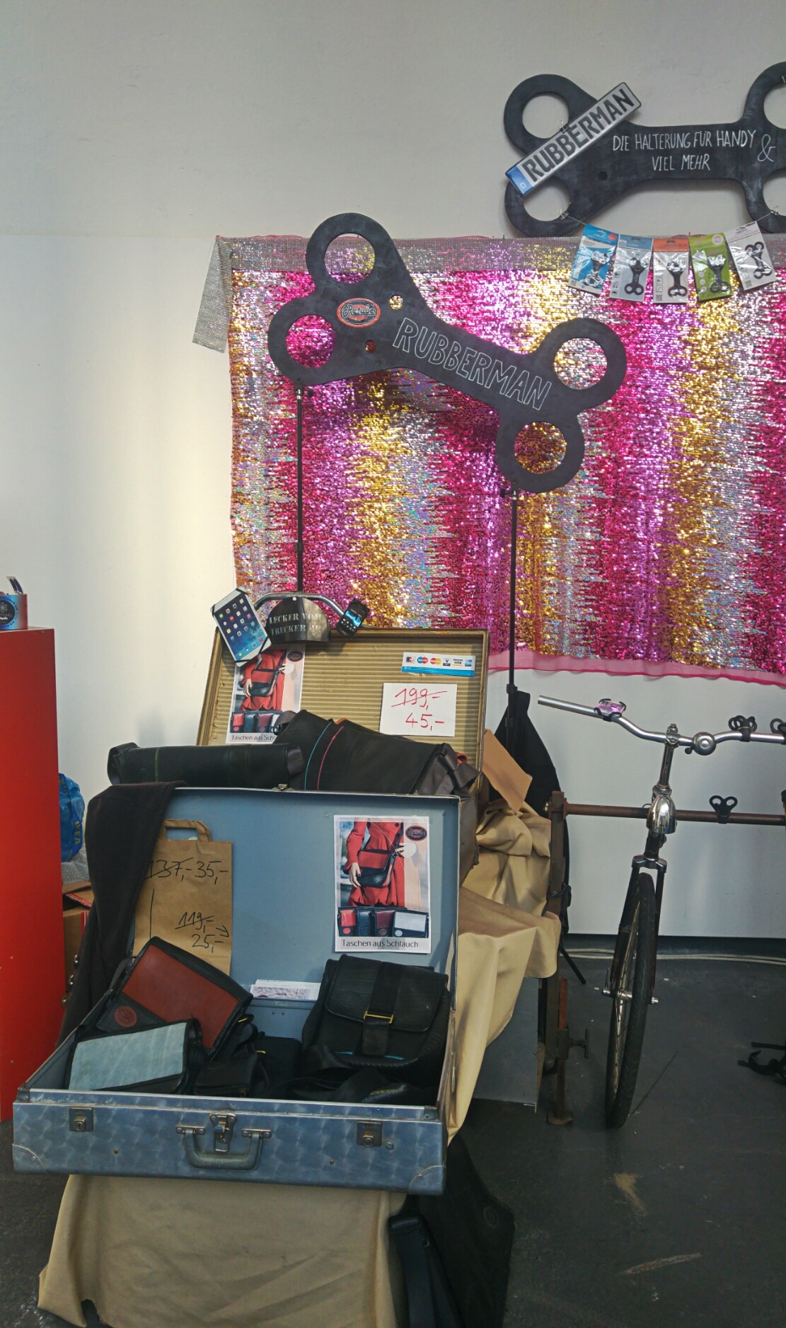 Bei meinem Rundgang traf ich auch auf Redtube aus Hamburg und seinen Rubberman. Björn Claßen fertigt Accessoires – wie Taschen fürs Fahrrad – aus alten Schläuchen und Traktor-Schlauch. Besonders ins Auge gefallen ist mir die multifunktionale Handyhalterung, die auch als Flaschenhalter oder Aufsteller funktioniert. Kleiner Tipp vom Hersteller: Vor der ersten Nutzung sollte das Gummi erst einmal ordentlich gedehnt werden. Da wird die Halterung zum Expander ;-).